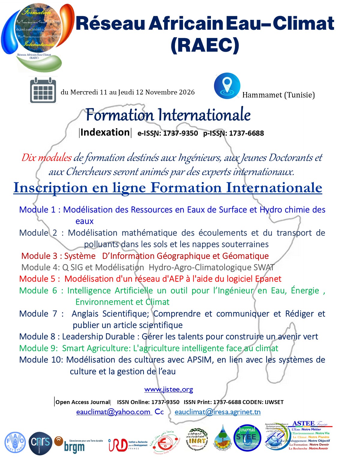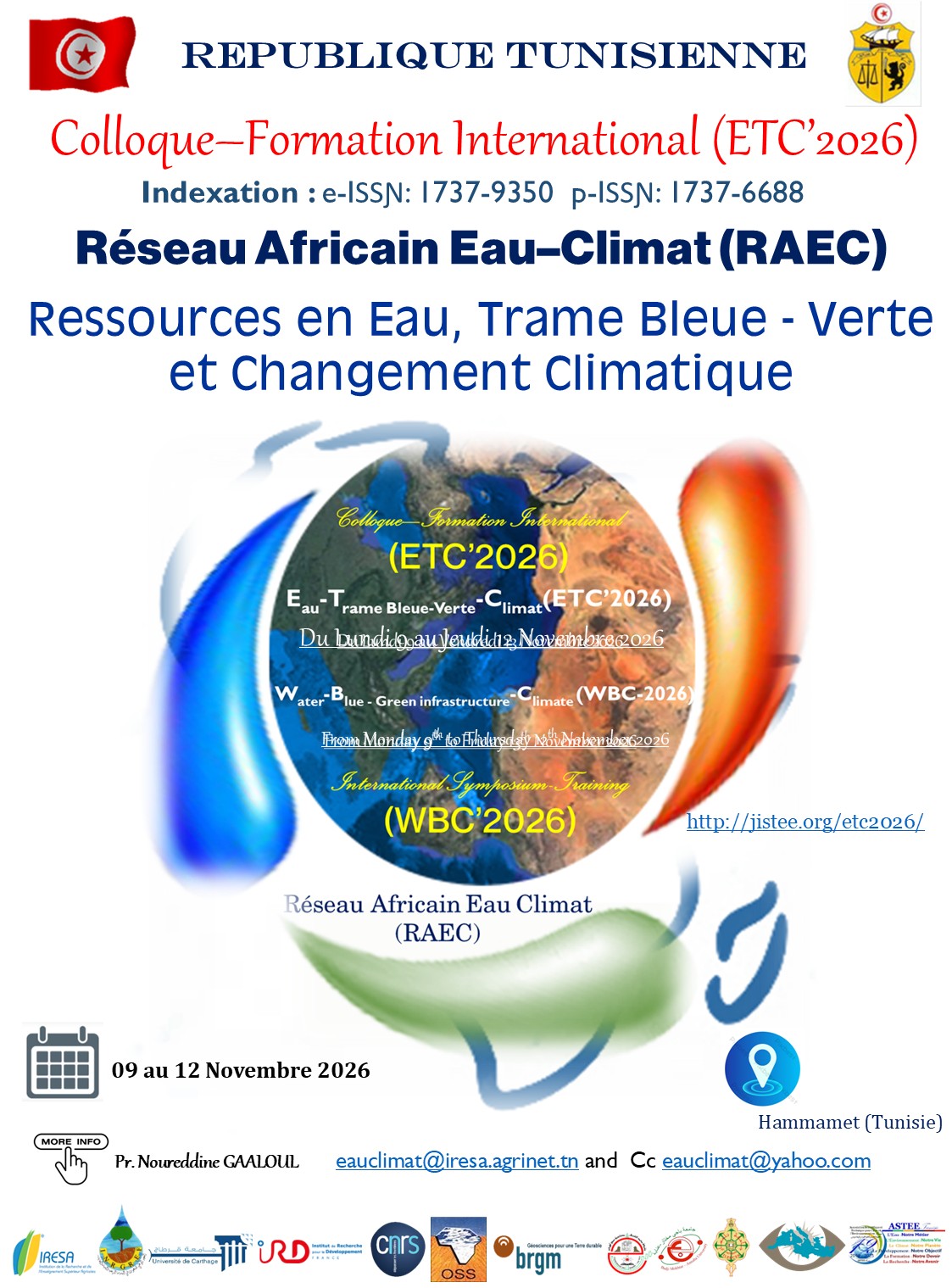 We are pleased to invite you to ETC 2026, an international scientific conference on Water-Blue Green infrastruture and Climate. The event will take place on November 8 to 13, 2026, at Hammamet (Tunisia)