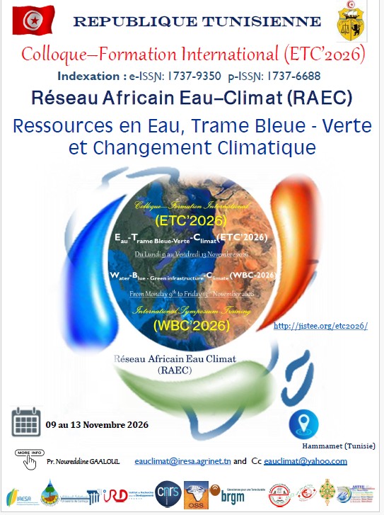 We are pleased to invite you to ETC 2026, an international scientific conference on Water-Blue Green infrastruture and Climate. The event will take place on November 8 to 14, 2026, at Hammamet (Tunisia)